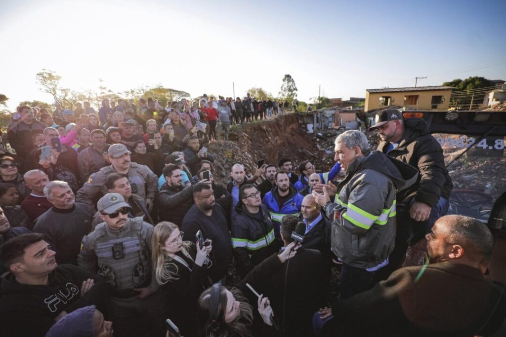 O dique Nova Brasília, no bairro Sarandi, registrou vazamento na tarde desta quarta-feira (25), confirmado pelo prefeito de Porto Alegre, Sebastião Melo. A infiltração, que foi notificada pelos moradores da região no começo da tarde, acontece na parte inferior do dique e está sendo contida com argila, uma solução considerada “paliativa” pelo prefeito. Em coletiva em frente ao dique, Melo afirmou que “não há nenhuma informação” sobre possibilidade da estrutura extravasar e que “não tem necessidade” de evacuar o Sarandi. Moradores, que acompanham de perto o caso desde que um filete de água surgiu por baixo do dique, relatam estarem apavorados com a situação, que lembra aquela enfrentada na enchente do ano passado. “Hoje de tarde a gente teve a notícia de que havia um vazamento. Havia suspeita, e há ainda suspeita por parte de moradores, de que esse vazamento possa ser produto de um cano, que eles chamam cano comunitário. Mas não houve, enfim, a vistoria até o fundo do cano para ver se de fato saía desse cano ou não. E é uma situação de pânico aqui no bairro nos últimos dias”, comenta Mauricio Lorenzzato, presidente da Associação de Atingidos do bairro Sarandi. O bairro foi um dos mais afetados pelas águas em maio de 2024 e, mesmo passado um ano do evento histórico, a região permanece despreparada, sem conclusão do reforço na estrutura de proteção contra cheias no local. Em março deste ano, as obras emergenciais, que visam elevar a cota do dique para 5,8 metros, acima do nível registrado na enchente de maio de 2024, foram interrompidas por decisão judicial. Nesta segunda (23), a Justiça negou mais uma vez o pedido da Prefeitura de Porto Alegre para retomar de forma imediata as obras e demolições no entorno do dique. O pedido previa a demolição de casas desocupadas, destruídas ou em escombros na rua Aderbal Rocha de Fraga, área junto à estrutura. De acordo com relatório da Prefeitura, dez famílias permanecem no local. Dessas, três estão em fase avançada nas tratativas para aquisição de novas residências por meio do programa federal Compra Assistida. Já sete famílias ainda aguardam as negociações. Na mesma coletiva realizada durante a tarde, o prefeito Sebastião Melo disse que irá desobedecer a ordem judicial e iniciará as obras “assim que a cidade secar”, já tendo informado a Procuradoria-Geral do Município sobre sua decisão. O prefeito também disse que não há previsão de chuva para o final de semana, citando o Instituto de Pesquisas Hidráulicas (IPH/UFRGS), com os rios “se estabilizando”. Atualmente, o Guaíba está com cota de 3,44 metros. “Há uma amorosidade da Prefeitura em buscar soluções concretas para, ao mesmo tempo, fazer a obra e garantir o direito de moradia das pessoas. Os moradores em nenhum momento entraram na Justiça. Quem entrou na Justiça foi o Melo, que optou por cessar a negociação e testar judicialmente a sua tese”, pontua Lorenzzato. “É uma obra que é necessária, mas que precisa ser feita garantindo o direito à moradia de todas as pessoas que porventura possam ser afetadas”. Em nota, a Prefeitura de Porto Alegre informou ao Sul21 que as equipes do Dmae permanecerão mobilizadas até a contenção da infiltração e que o prefeito determinou a adoção de “medidas preventivas” quanto ao dique do Sarandi. Ainda, a Prefeitura diz que o reforço “acontece por meio de argila, e não substitui a retomada da obra iniciada em agosto de 2024”.